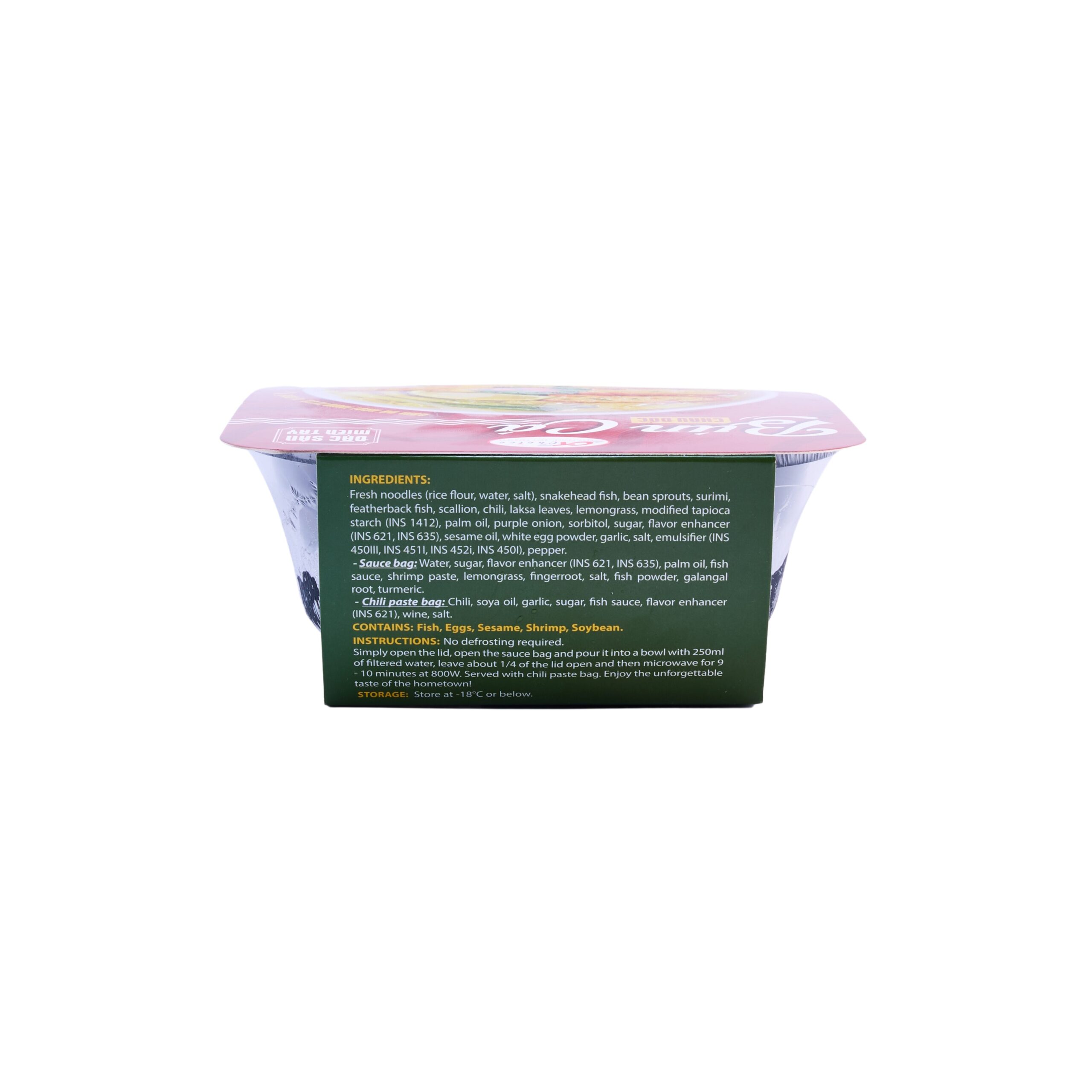 Ingredients: Fresh noodle 51%, ( rice flour, water, salt), Snakehead 14.8%, Bean sprout, Surimi 5.6%, Featherback 5.6%, Spring onion, Chilli, Knotgrass, Lemon grass, Modified tapioca starch (INS 1412), palm oil, purple onion, Sorbitol, sugar, flavour enhancer (INS 621, INS 635), sesame oil, white egg powder, garlic, Salt, emusifier ( INS 450iii, INS 451i,INS 452i, INS 450i), transglutaminate, pepper. Sauce bag: Water, Sugar, Flavour enhancer ( INS621, INS 635), Palm oil, Fish sauce, Shrimp paste, Lemon grass, Auttum crosscus, Salt, Fish powder, Gatangal, Tumaric. Chilli paste: Chilli, Soya oil, Garlic, Sugar, Fish sauce, Flavour enhancer (INS 621), Wine, Salt.