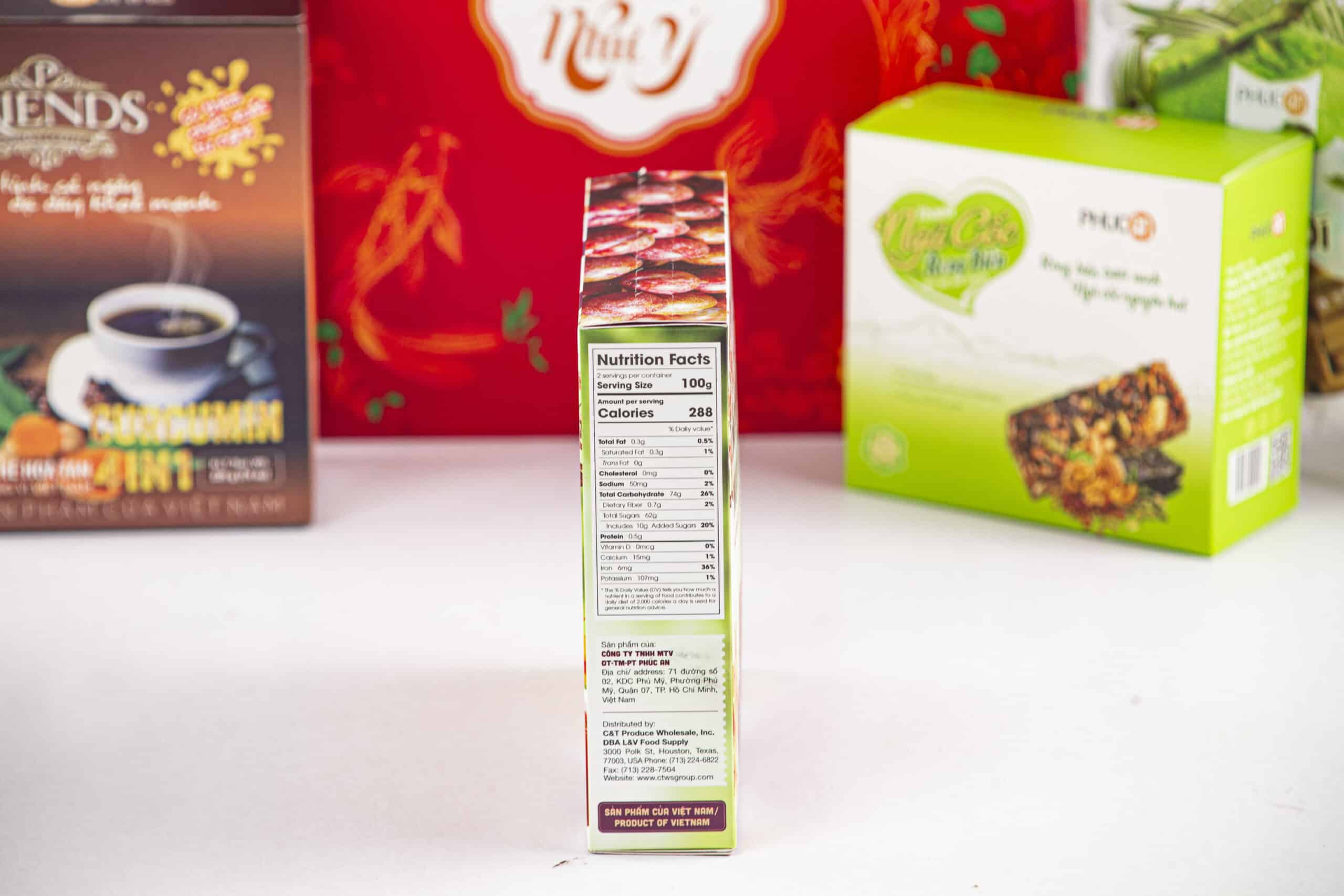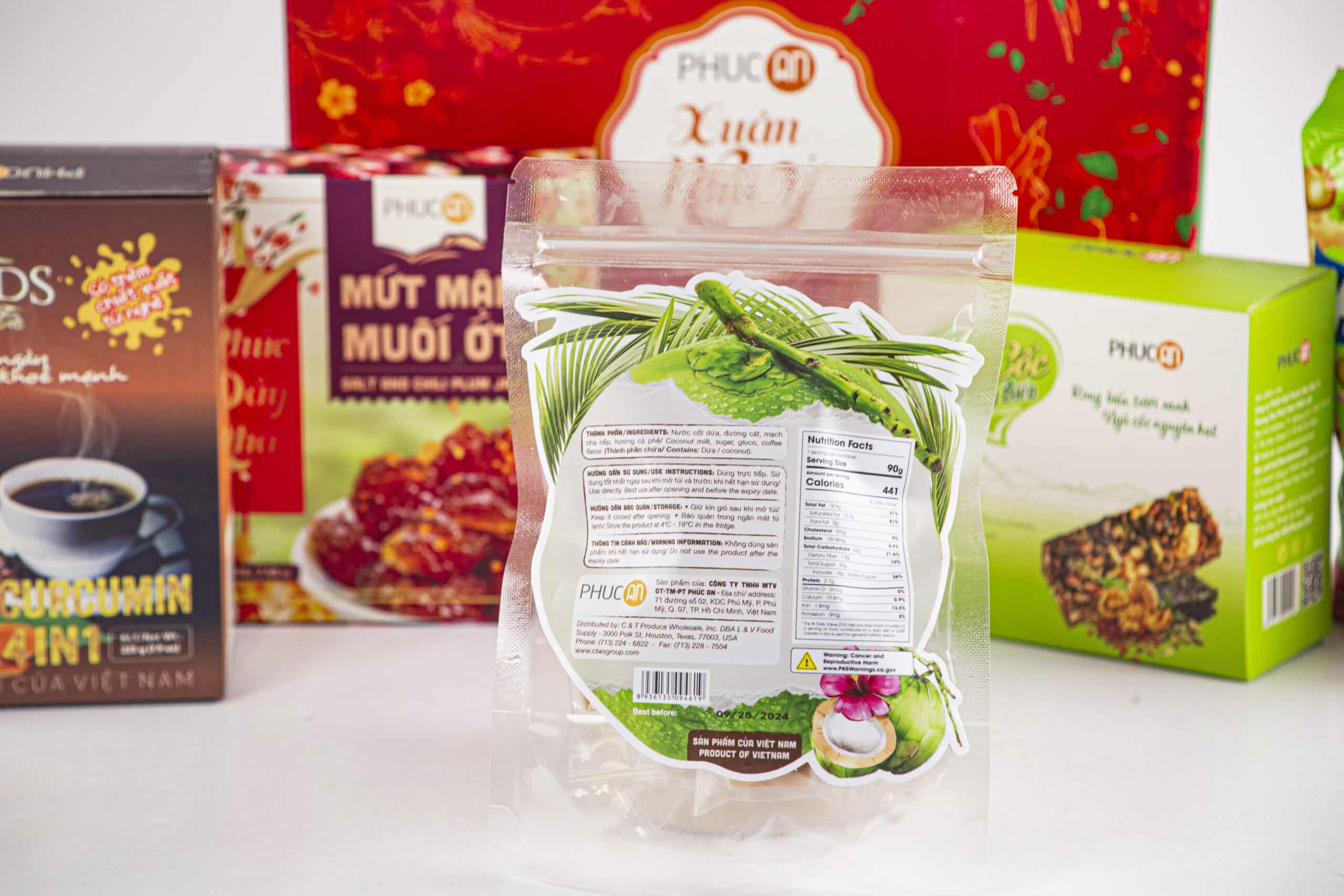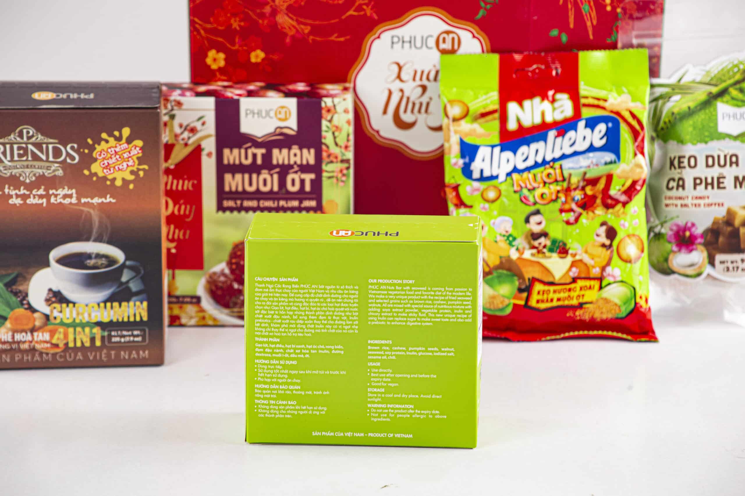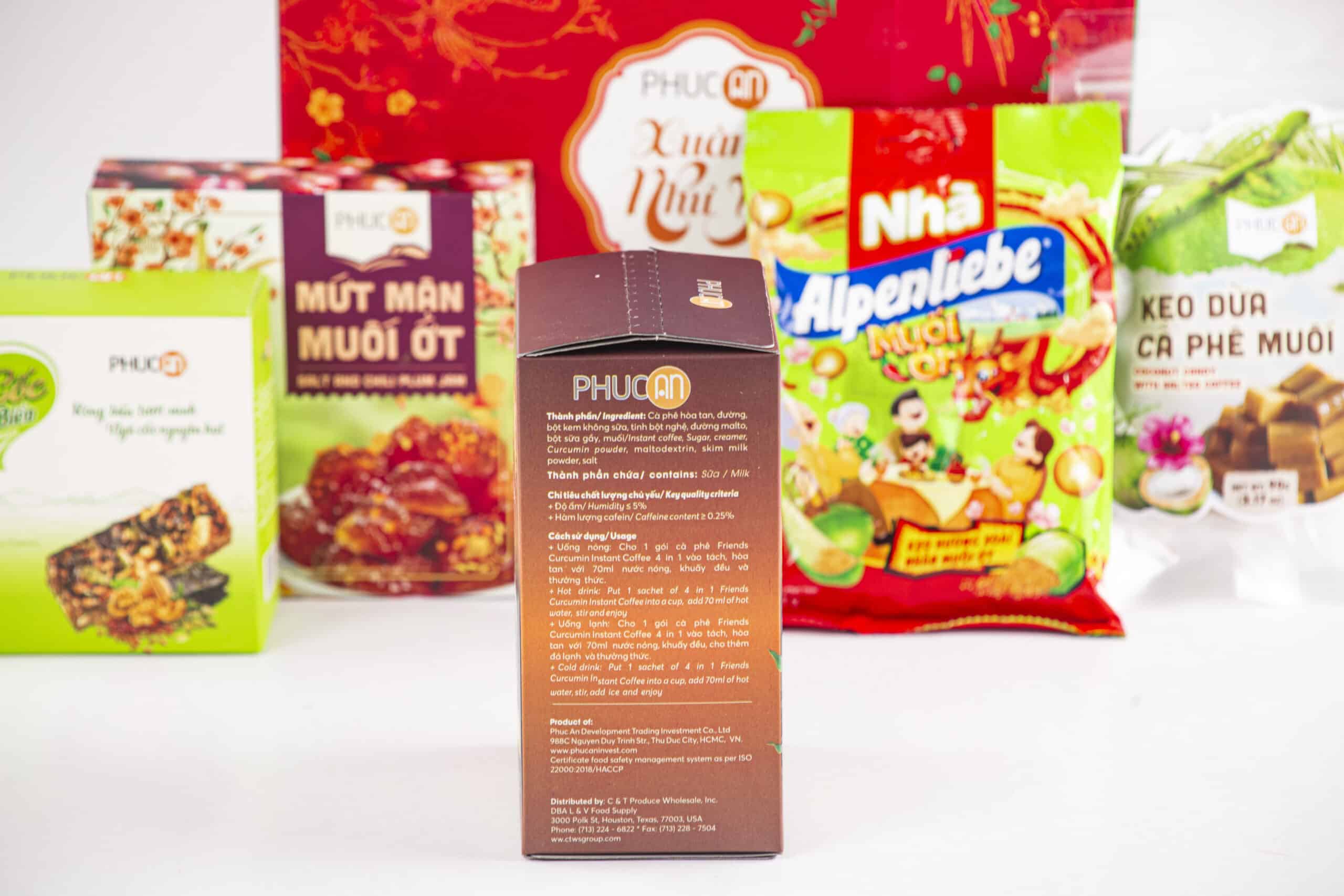 Ingredients: Brown rice, cashew, pumkin seeds, walnut, seaweed, soy protein, inulin, gluco, iodized salt, sesame oils, chili. Candy salt anh chili, plum, coffee, Coconut milk, sugar, gluco, coffee flavor