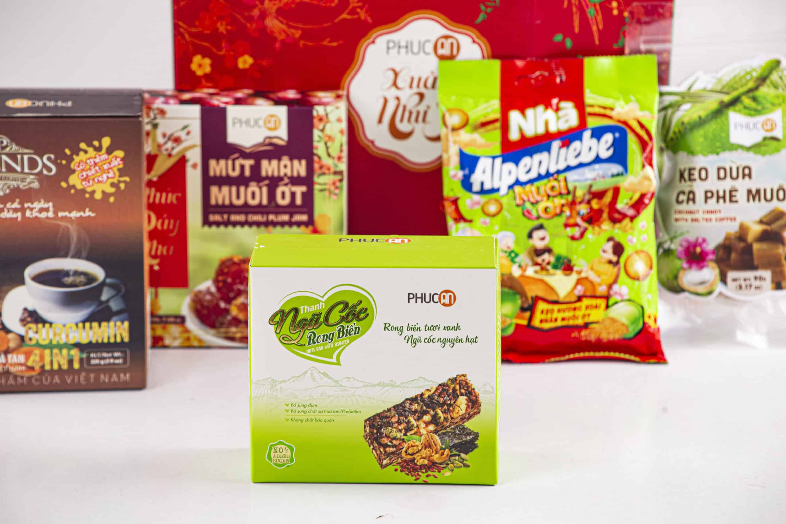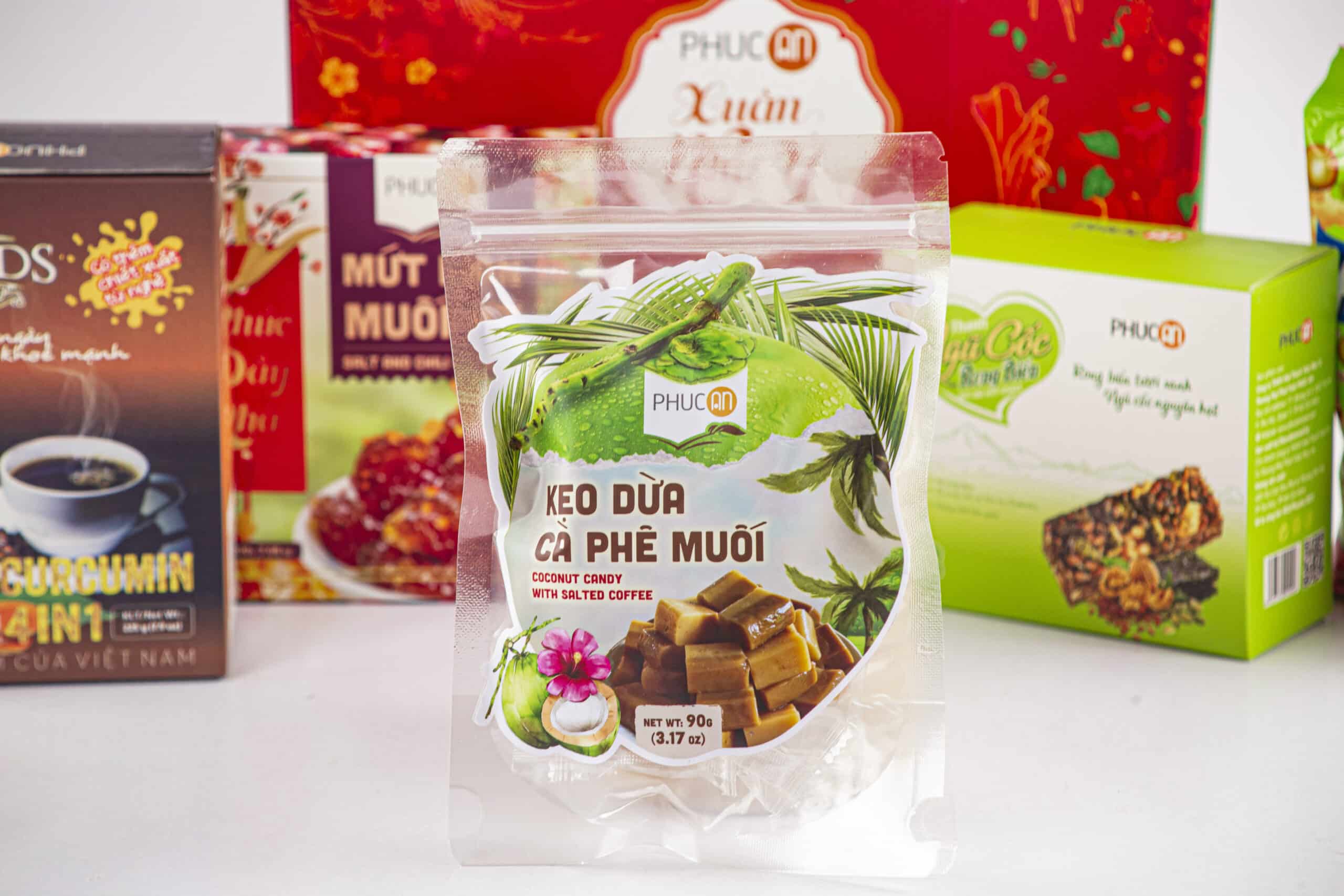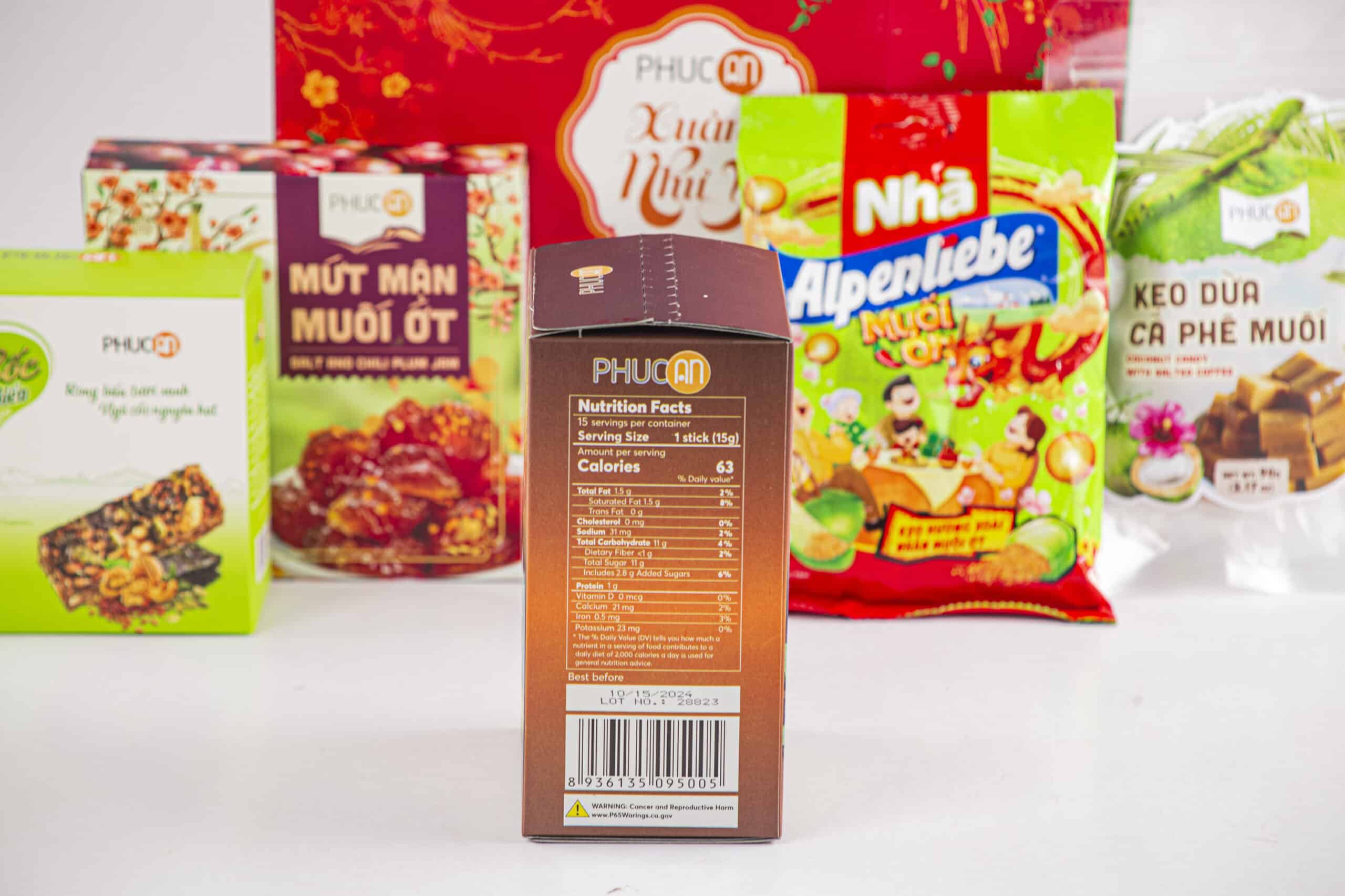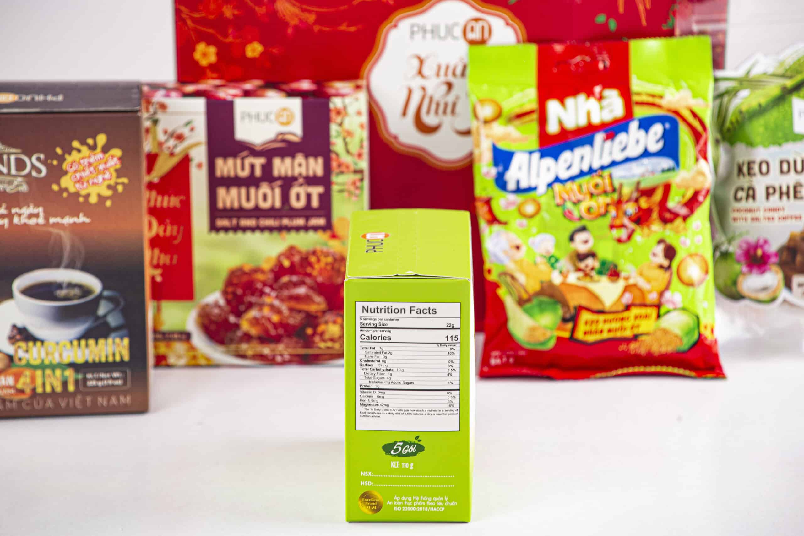 Ingredients: Brown rice, cashew, pumkin seeds, walnut, seaweed, soy protein, inulin, gluco, iodized salt, sesame oils, chili. Candy salt anh chili, plum, coffee, Coconut milk, sugar, gluco, coffee flavor