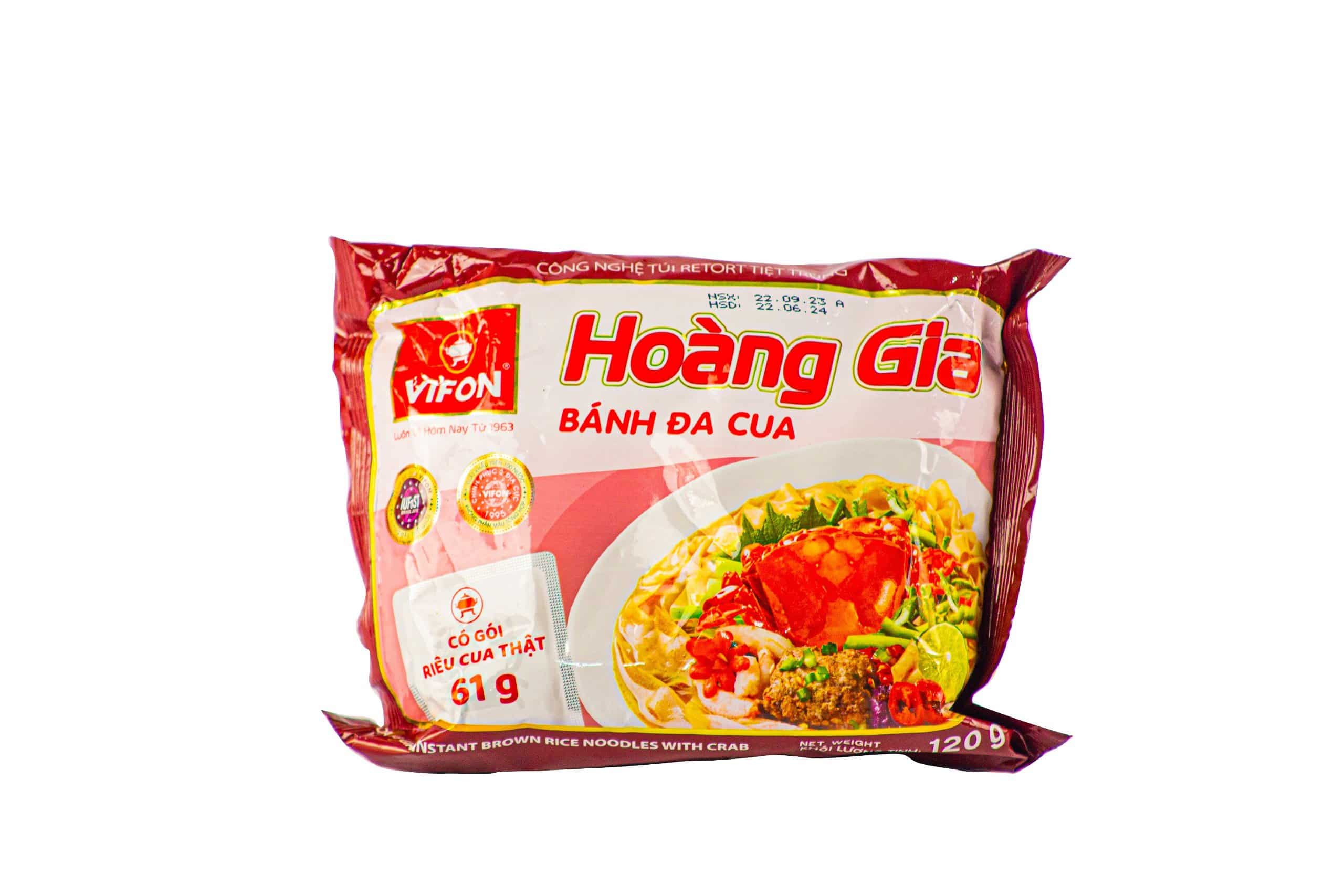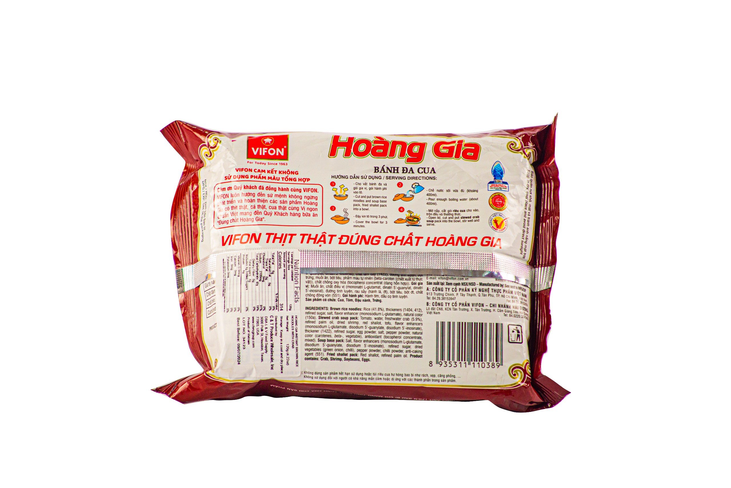 Ingredients: Rice, thickeners, refined sugar, salt, flavor enhancer, natural color, stewed crab soup pack,: Tomato, water, freshwater crab, refined paim oil, dried shrimp, red shallot, tofu, flavor enhancers, thickener, refined sugar, egg powder, salt, pepper powder, natural color, antioxidant. Soup base pack: Salt, Flavor enhacers, refined sugar, dried vegetables, pepper powder, chili powder, anti caking agent. Fried shallot pack: Red shallot, refined palm oil.